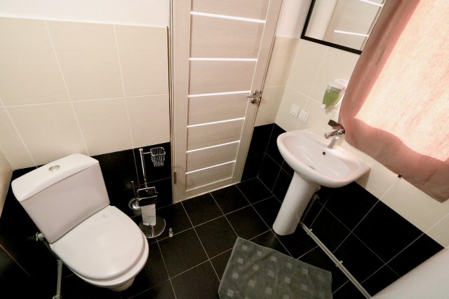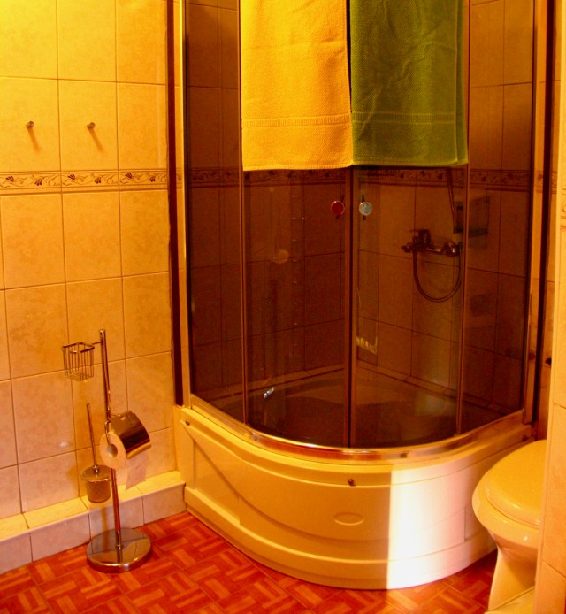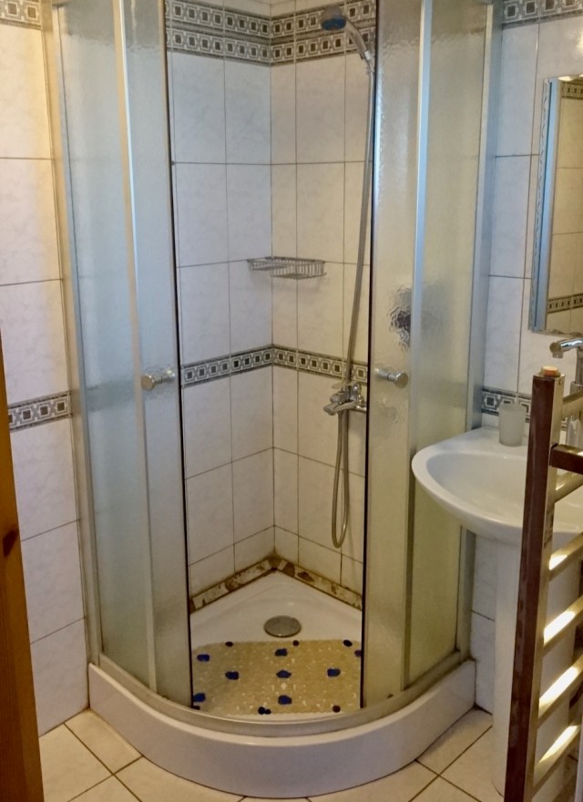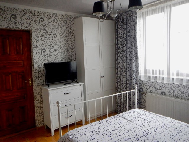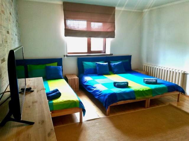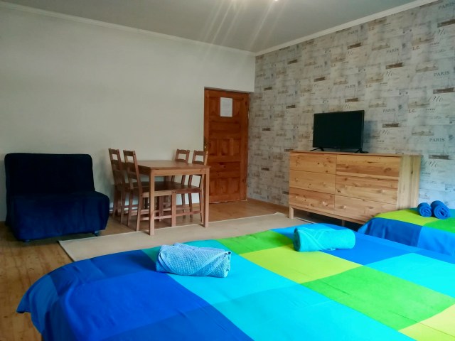Completely separate upstairs apartment ideal for large groups. There is one queen-size double bed, one single bed, two sofas that can be converted into single beds and one chair that can be folded out into a single bed. It features one shower, two toilets and two sinks. There is a table with four chairs.